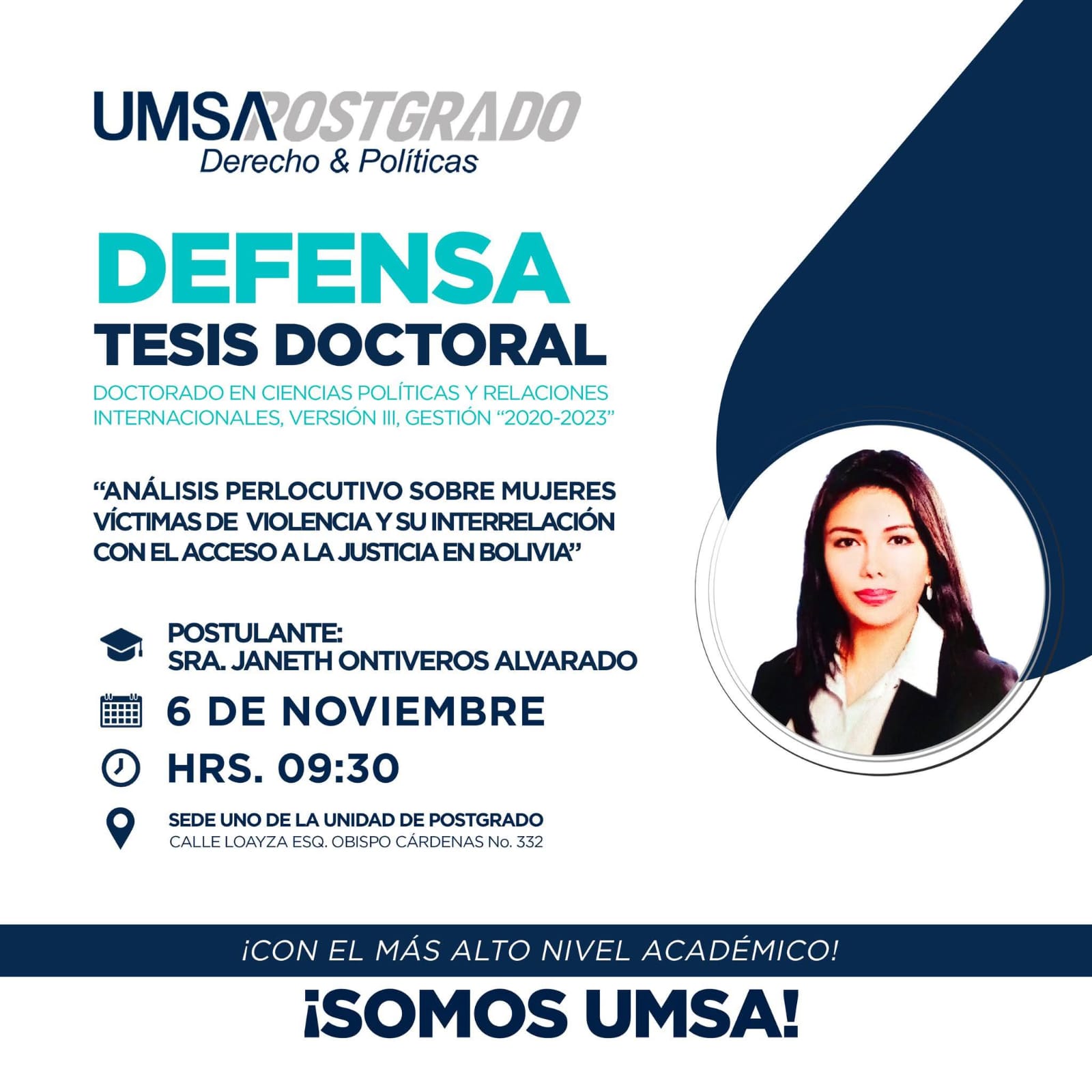 La 𝐔𝐧𝐢𝐝𝐚𝐝 𝐝𝐞 𝐏𝐨𝐬𝐭𝐠𝐫𝐚𝐝𝐨 𝐲 𝐑𝐞𝐥𝐚𝐜𝐢𝐨𝐧𝐞𝐬 𝐈𝐧𝐭𝐞𝐫𝐧𝐚𝐜𝐢𝐨𝐧𝐚𝐥𝐞𝐬 extiende la invitación a la defensa pública de Tesis Doctoral de la postulante: Sra. Janeth Ontiveros Alvarado, en el marco del programa de 𝐃𝐨𝐜𝐭𝐨𝐫𝐚𝐝𝐨 𝐞𝐧 𝐂𝐢𝐞𝐧𝐜𝐢𝐚𝐬 𝐏𝐨𝐥𝐢́𝐭𝐢𝐜𝐚𝐬 𝐲 𝐑𝐞𝐥𝐚𝐜𝐢𝐨𝐧𝐞𝐬 𝐈𝐧𝐭𝐞𝐫𝐧𝐚𝐜𝐢𝐨𝐧𝐚𝐥𝐞𝐬, 𝐕𝐞𝐫𝐬𝐢𝐨́𝐧 𝐈𝐈𝐈, 𝐆𝐞𝐬𝐭𝐢𝐨́𝐧 𝟐𝟎𝟐𝟎–𝟐𝟎𝟐𝟑.